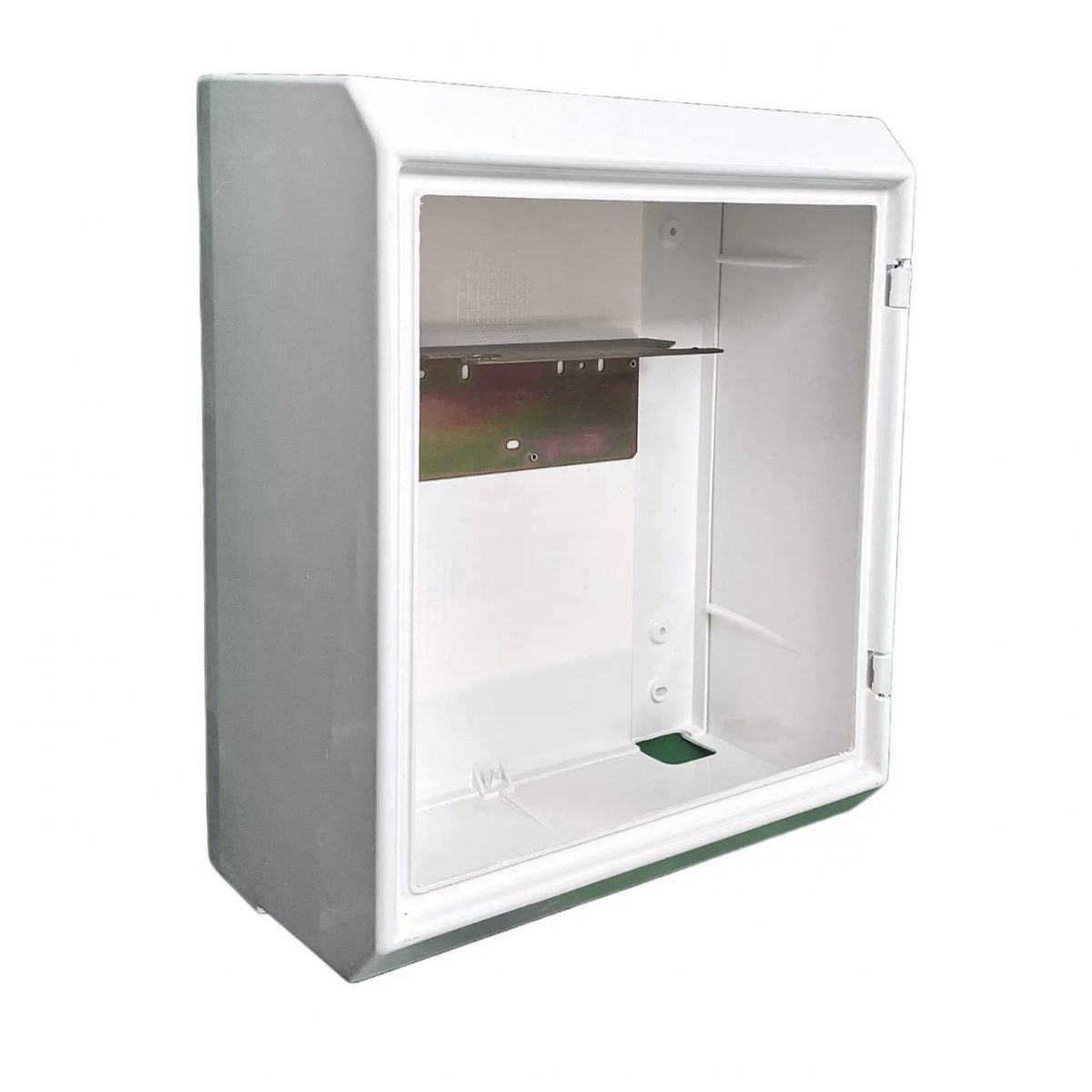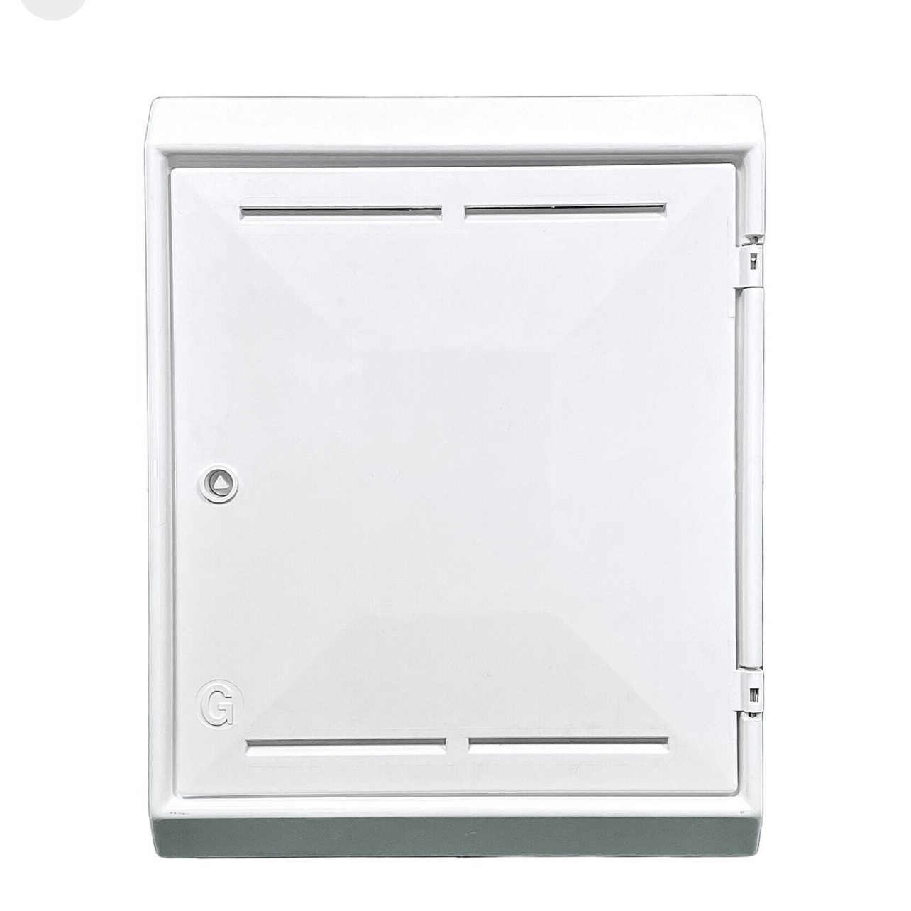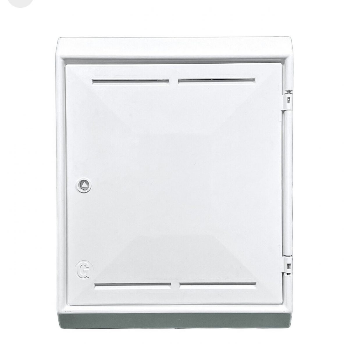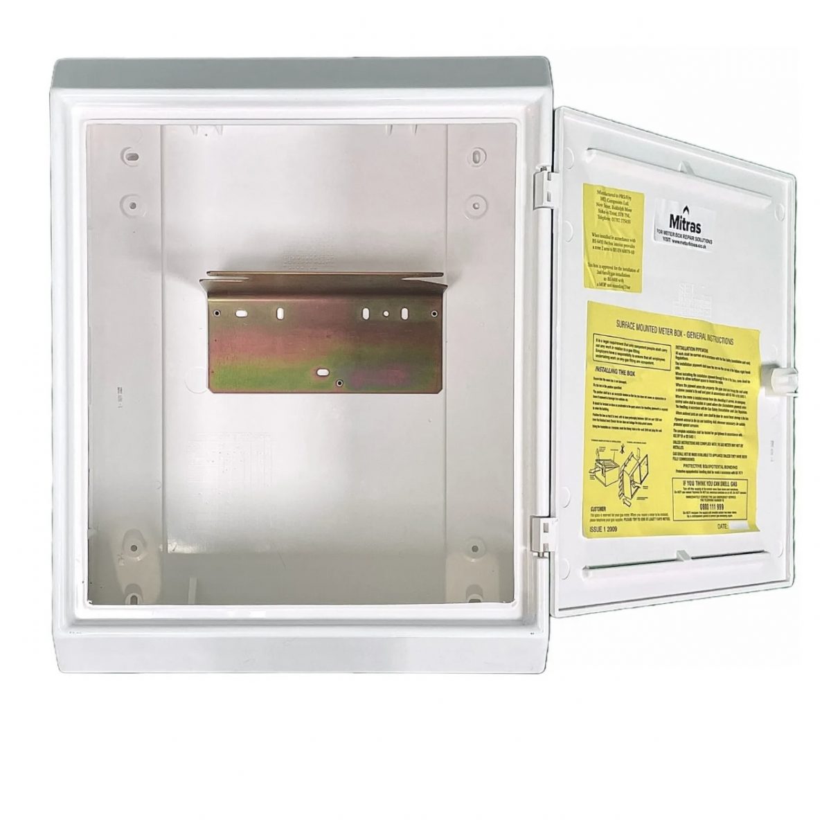 Wall-mounted domestic meter box. White glass fibre meter boxes with key. Wall-mounted, with fitted meter bracket. Known as Mark 2 boxes.